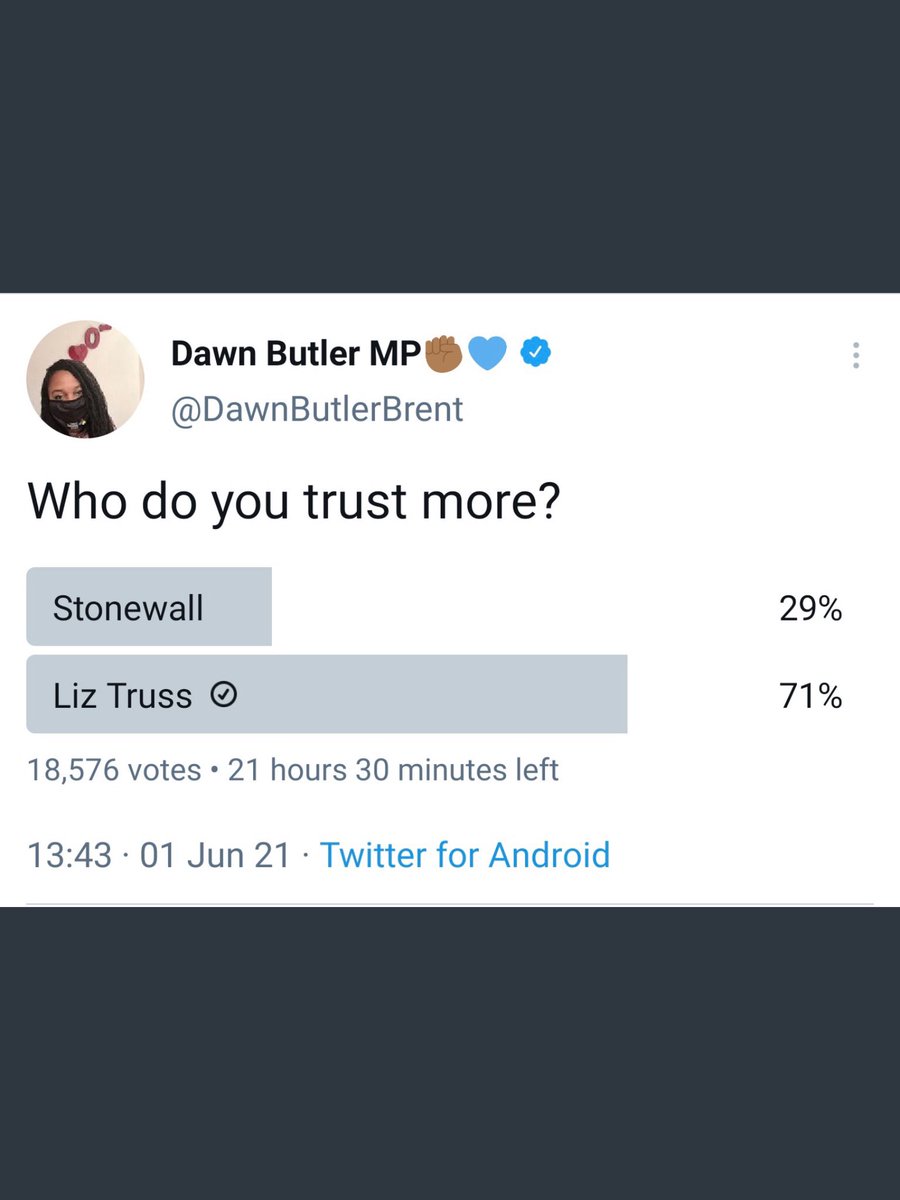 This Dawn Butler who spectacularly fails to read the room. The numbers are not looking good for Stonewall. Dawn Butler MP DawnButlerBrent June 1 2021 Butlers folly gave anyone with a Twitter account the opportunity to have their say.